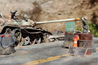 Encargo para el coleccionista y amigo Manuel de la realización de un diorama de una carretera de Irak con T 55 destruido; escala 1/35.